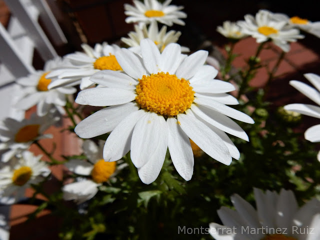lígulas blancas y flores centrales amarillas. Florece en primavera hasta el
