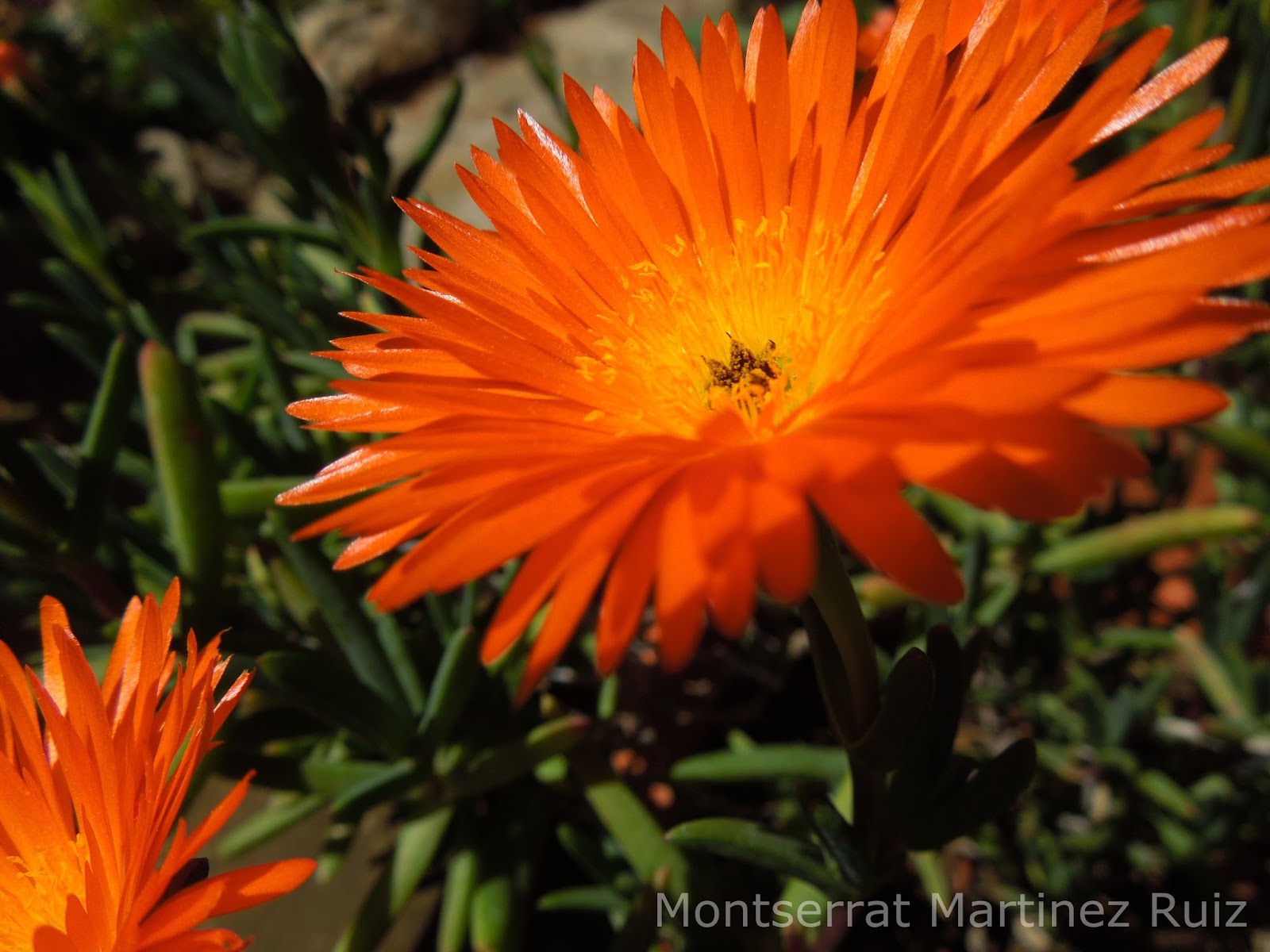 Mi Mesem naranja, así lo llamo yo, primero estuvo en tierra y después lo pasé a una maceta porque lo veía algo debilitado. Allí ha permanecido un par de años y este otoño lo separé en tres esquejes que planté en distintas zonas de rocalla del jardín.