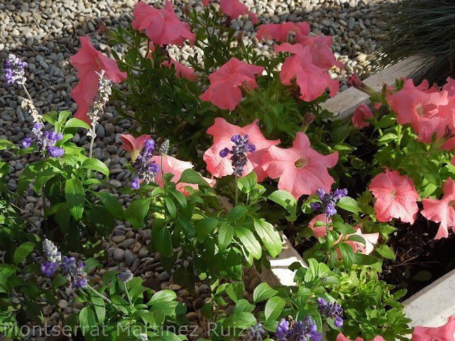 Petunias rosas (Petunia x hybrida) y Salvia azul (Salvia farinacea ssp. Victoria) ambas suelo plantarlas de las semillas que recojo en estas fechas y estarán floreciendo hasta el otoño.