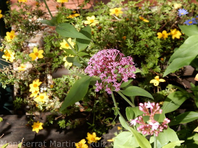 La valeriana roja o Milamores (Centranthus ruber) que florece en Abril y al fondo, en amarillo, la Bidens (Bidens ferulifolia, L.) que está florecida todo el año.