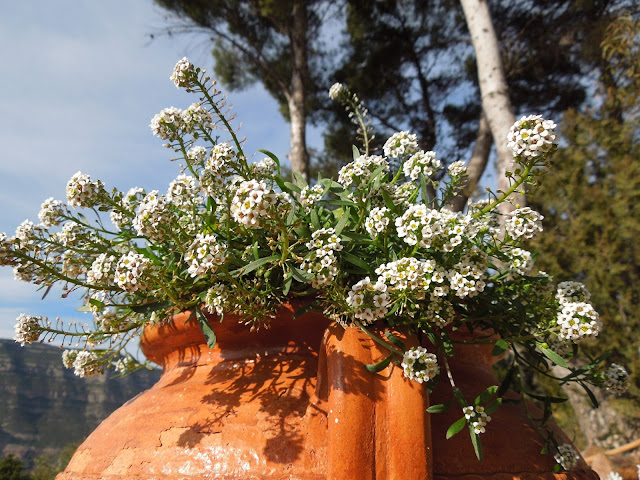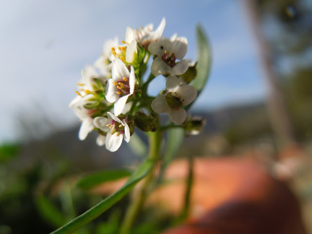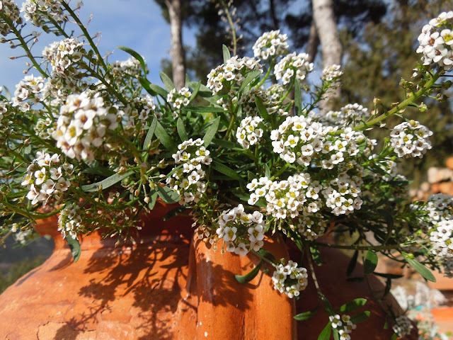 Conocida como Aliso de mar, alisón, barba blanca, hierba blanca, mastuerzo, mastuerzo marino, mastuerzo marítimo, proqueletes, proqueletes de plata, siempre en flor, caps blancs (en catalán) entre otros, Alyssum maritimum, L. crece en mi jardín de forma espontánea.
