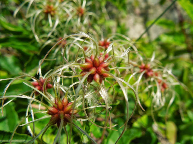 Unas florecillas de Clematis (Clematis vitalba, L.) enrolladas a una valla metálica.