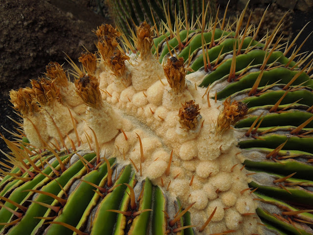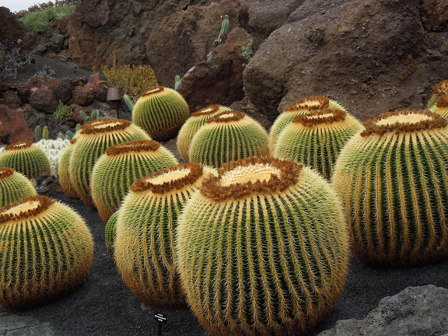 Al visitar este Jardín de Cactus de Lanzarote lo primero que nos impresiona a todos son estos redondos y enormes cactus, con sus amenazadoras espinas, son Echinocactus.