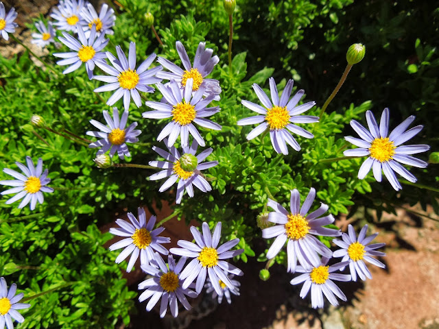 De las semillas de magnolio no he obtenido ningún resultado, pero de las de palmera sí, dos de ellas han germinado. En la primera foto vemos una de ellas, compartiendo maceta con un esqueje de Felicia (Felicia amelloides)