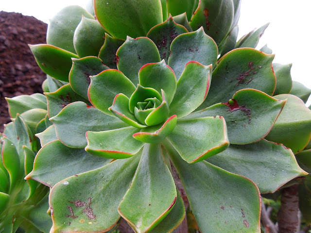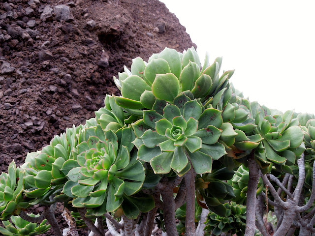 Como broche de oro, este Aeonium lanzerottense, endenismo de la isla de Lanzarote, como su nombre indica. Una planta suculenta, de la familia Crassulaceae, semi-arbustiva, de tallos ramificados y hojas en forma de roseta. Tiene una espectacular floración rosada en una densa inflorescencia.