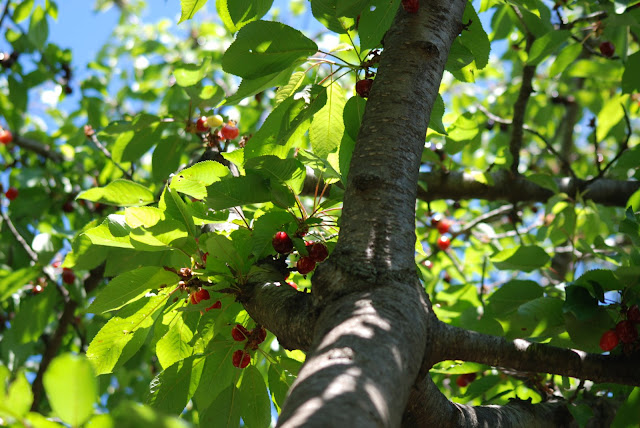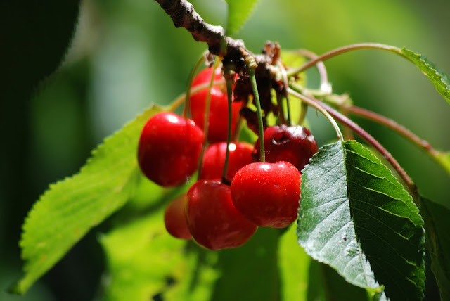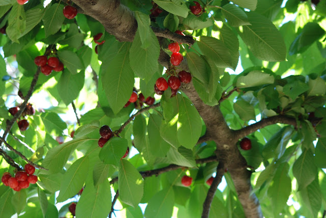 Las cerezas ya van cogiendo color rojo, el pequeño cerezo, que apenas tiene metro y medio de altura ha hecho su primera producción ¡nada, unas ocho cerezas tan sólo! pero yo estoy contenta porque la plantación ha ido bien y más adelante me ocuparé de hacerle algún injerto tal y como me recomendasteis.