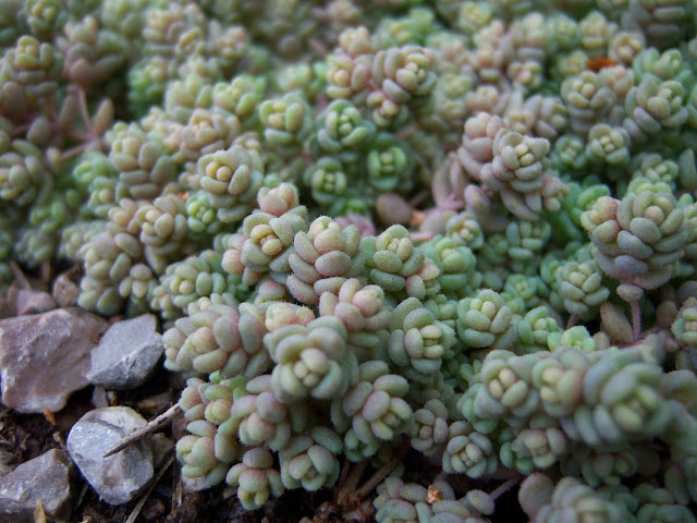 Arreglando un tramo de escalera saqué el Sedum uguetas (Sedum dasyphyllum) de entre la rocalla y se me ocurrió plantarlo dentro de una vieja y pequeña vasija de barro, una ollita que ya no se hacía servir. Parece que el cambio le ha sentado bien ¡está más florido que nunca!