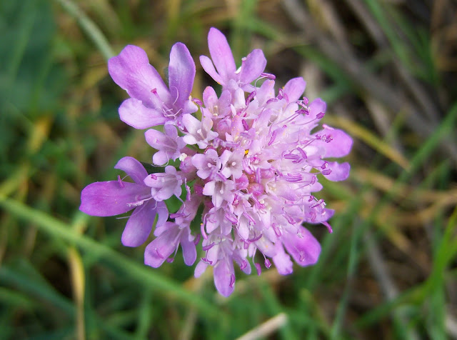 Flores en capítulos globosos u ovoides, brácteas dispuestas de 1 a 3 filas más cortas que las flores. Cáliz de 5 sépalos soldados y corola de color rosa-violeta, azul-violeta o rara vez blanquecina de tubo peloso interior y 5 estambres con anteras lilas con ovario de estigma y estilo aplanado. Florece de junio a octubre.
