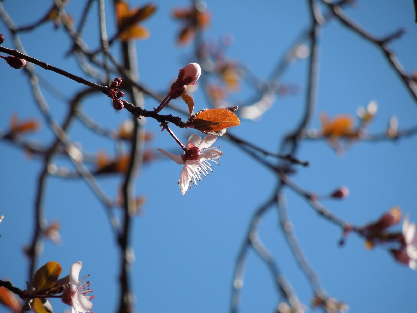 El Ciruelo rojo, también llamado Prunus Pisardii (Prunus cerasifera atropurpúrea) en una serie de fotografías con sus primeras flores.