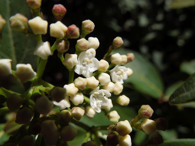 Al Durillo (Viburnum tinus) le estaba costando florecer, pero finalmente las primeras flores asoman y pronto podrá verse lleno de ellas, formando esa bonita imagen del blanco de sus flores en contraste con las hojas verde oscuras de este arbusto.